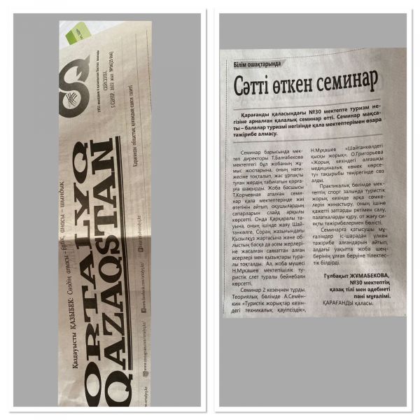 Қарағанды облыстық қоғамдық-саяси «ОРТАЛЫҚ ҚАЗАҚСТАН» газетінің 5 сәуір 2022ж. №36(23066) санында қазақ тілі мен әдебиеті пәні мұғалімі ЖумабековаГулбахит Амановнаның «Сәтті өткен семинар» атты мақаласы жарыққа шықты. Мақалада балалар туризмінің жұмыс орт