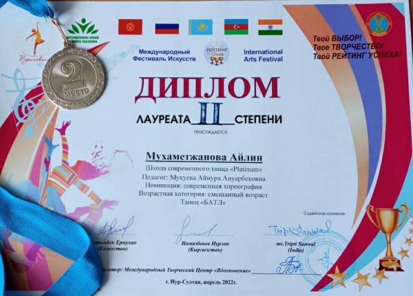 Мухаметжанова Айлин, ученица 1 "В" класса заняла 2 место на Международном конкурсе современных танцев в г. Нур-Султан