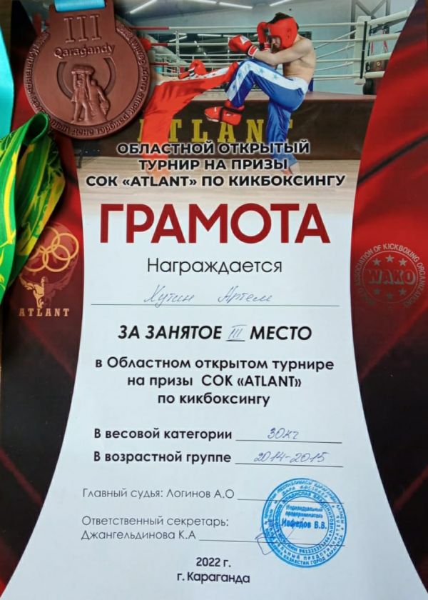 Хутин Артём, ученик 1 "В", класса занял 2 место в открытом чемпионате по кикбоксингу в г.Нур-Султан и занял 3 место в Областном открытом турнире по кикбоксингу.
