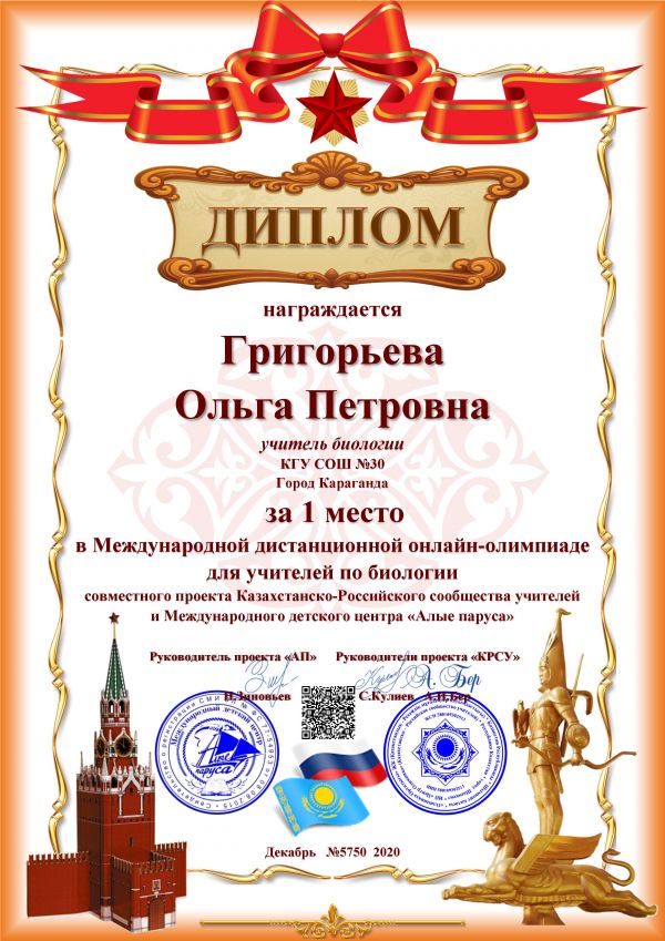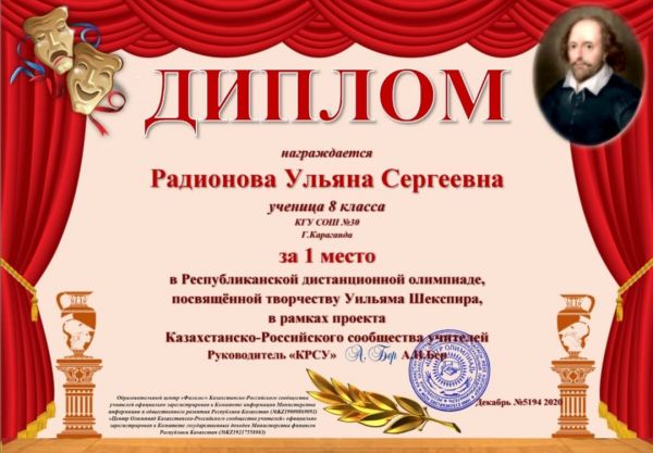 8 в сынып оқушысы Радионова Ульянаны Қазақстан -Ресей мұғалімдер қоғамдастығының жобасы шеңберінде Уильям Шекспирдің шығармашылығына арналған республикалық олимпиадада 1-орын алғаны үшін…