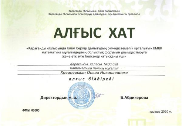Ковалевская О.Н. Қарағанды облысының математика мұғалімдер форумына қатысқаны үшін грамота және алғыс хатпен марапатталды, онда секция модераторы болды және: «ZOOM- программа для проведения он…