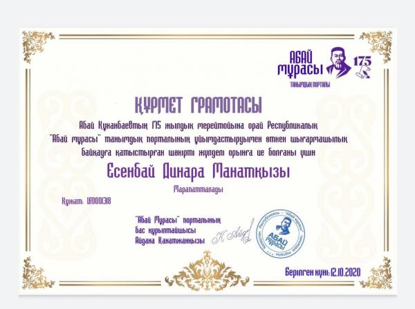 Есенбай Динара Манатқызының жүлделі орынға ие болған шәкірттері :5"А"сынып оқушысы Тілеугазы Айсара Ернатқызы" Абай айтқан асыл сөз "атты байқауда ұлы ақынның шығармашылығын дәрі…