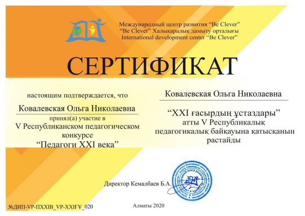 Поздравляем Ковалевскую О.Н. за занятое 1 место в пятом республиканском конкурсе «Педагоги 21 века» в номинации «Методическая разработка занятия». Хотим пожелать успехов в ра…