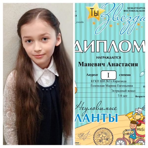 Поздравляем Маневич Анастасию, ученицу 4 "В" класса, за занятое 1 место в международном конкурсе по вокалу!