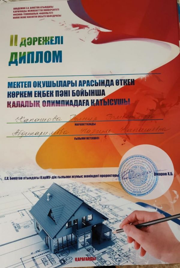 Ученица 9А класса Капашева Гүлнұр замяла 2 место в городской предместной олимпиаде среди школьников по образовальной области "Худошественный труд" организованный КарГУ им. Е. Букетова. Так…