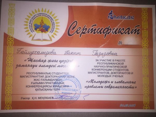 Учитель казахского языка и литературы Баймухамедоау Бахыт Газизовна приняла участие в работе республиканской научно-практической конференции студентов, магистрантов, докторов и молодых ученых "…