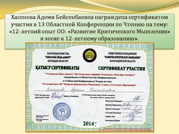 Учителя: Нуртазина Майра, Базарова Жулдыз Мунлыковна, Хасенова Адеми Бейсенбаевна награждены сертификатами участия в 13 Областной Конференции по Чтению на тему: «12-летний опыт ОО:…