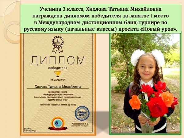 Хихлова Дина Андреевна награждена свидетельством за подготовку к участию в Международном дистанционном блиц-турнире проекта «Новый урок» учащихся, ставших победителями.