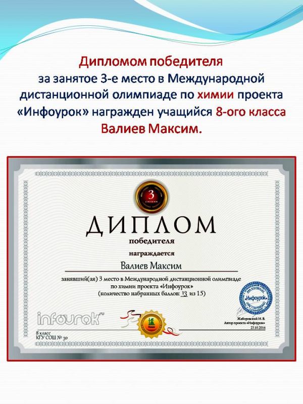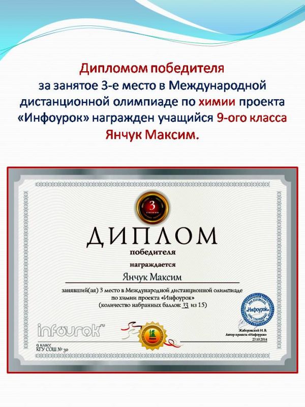 Учащиеся 8-х, 9-х, 11-х классов приняли активное участие в Международной дистанционной олимпиаде по химии проекта «Инфоурок».