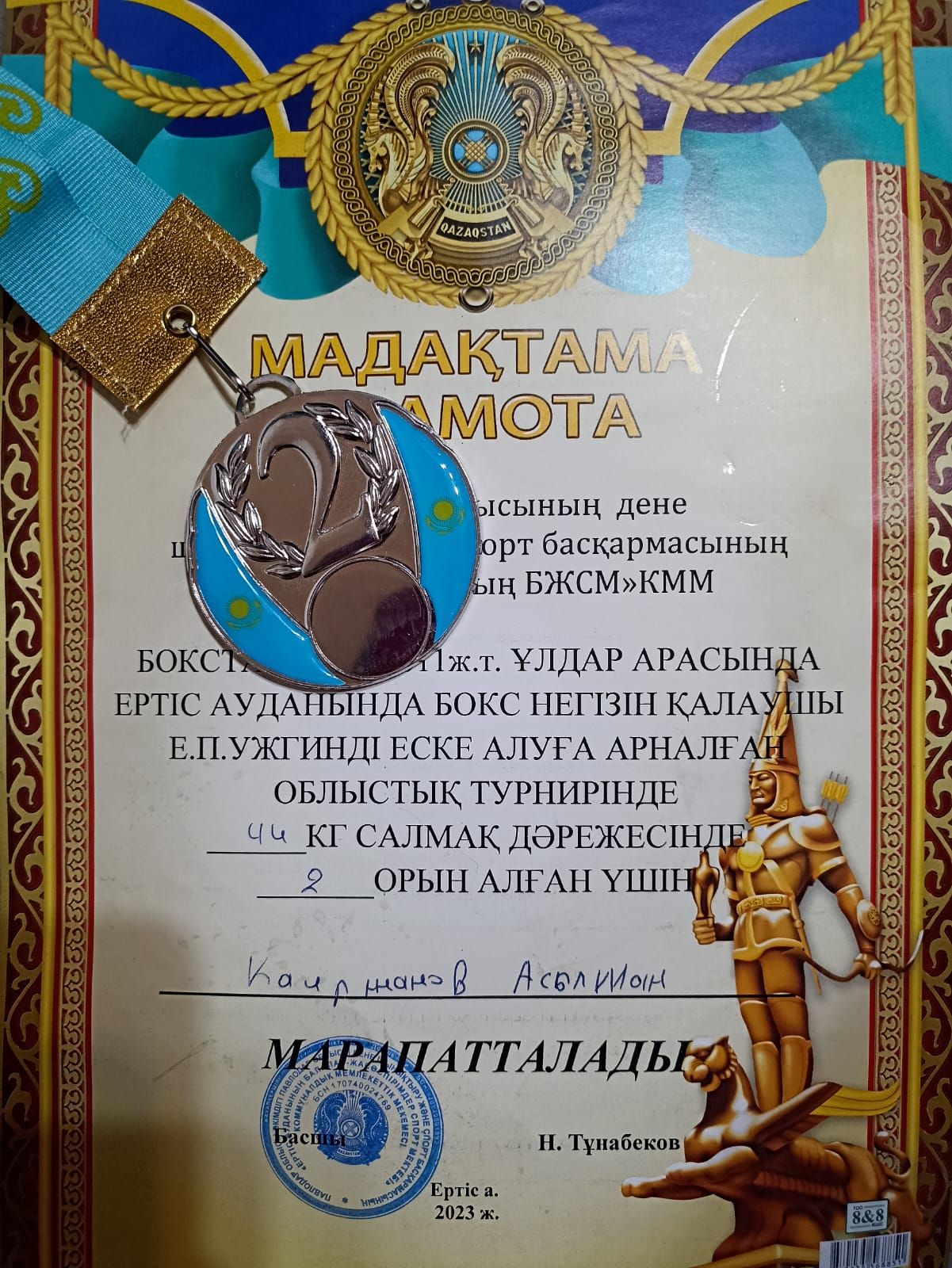 Бокстан 2010-2011ж. ұлдар арасындар Ертіс ауданында негізін қалаушы Е.П.Ужгинді еске алуға арналған облыстық турнирінде 2 орынды 8 «А» сынып оқушысы Каиржанов Асылжан иеленді. Құттықтаймыз, тек биіктерден көріне беруіңе тілектеспіз!!!