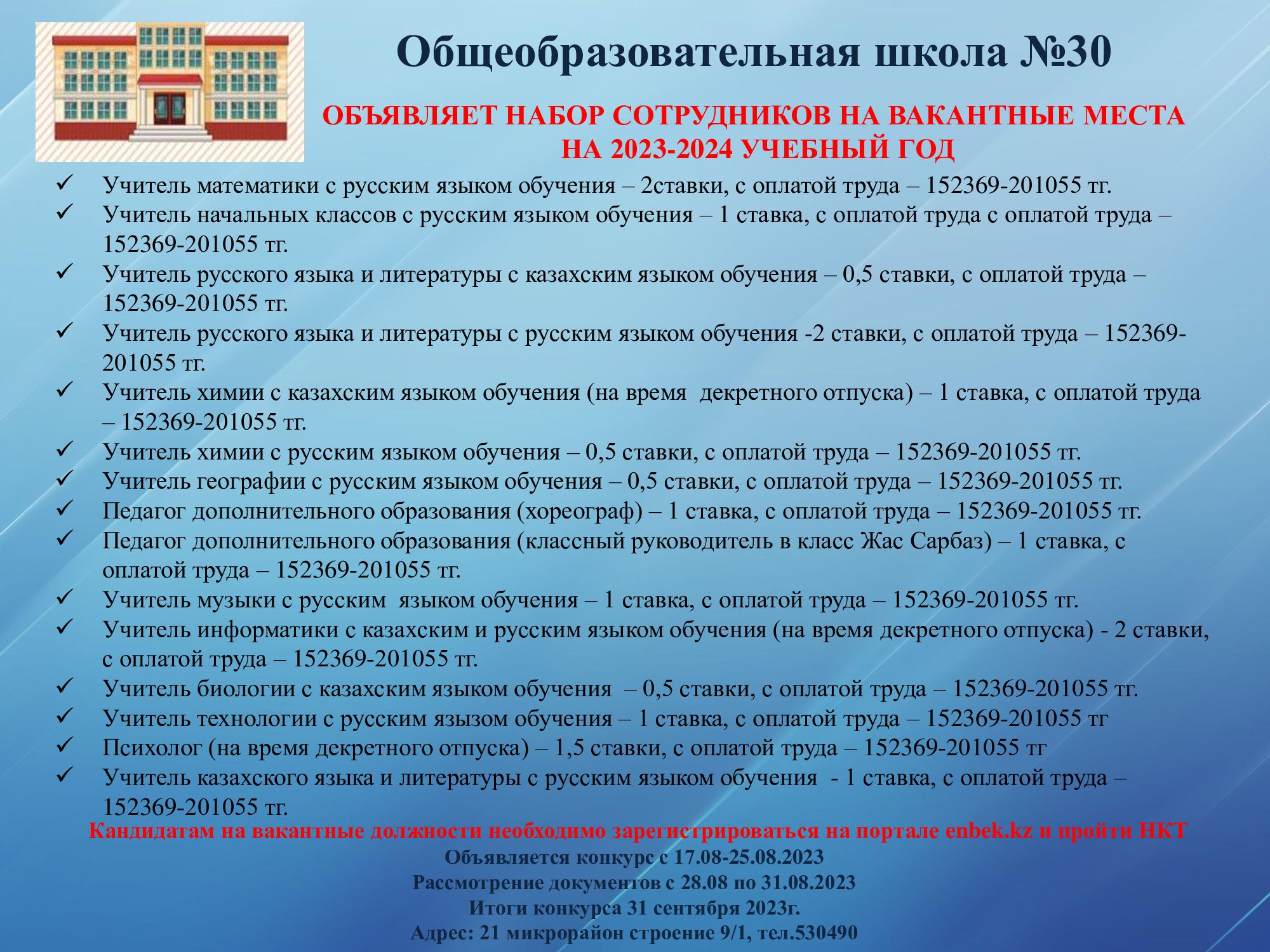 Общеобразовательная школа №30 объявляет набор сотрудников на вакантные места на 2023-2024 учебный год.