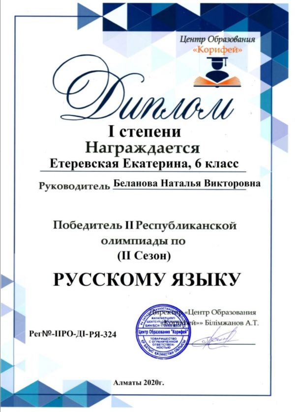 Поздравляем учениц 8 в класса: Сейчанову Лауру и Радионову Ульяну за занятое первое место в республиканской олимпиаде "Корифей" по предмету "русский язык"! Так держать!