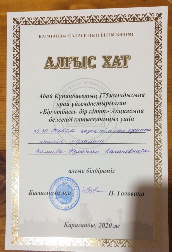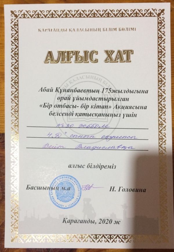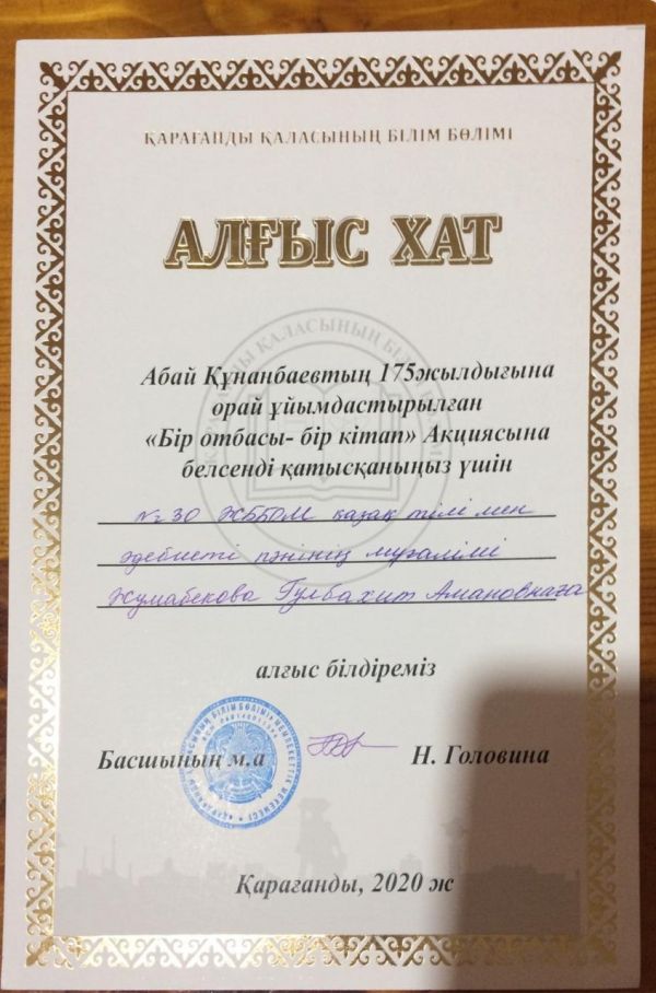 Қарағанды қаласының білім бөлімі Абай Құнанбаевтың 175 жылдығына орай ұйымдастырылған «Бір отбасы – бір кітап» Акциясына белсене қатысқаны үшін №30 ЖББОМ