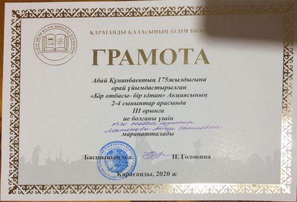 Қарағанды қаласының білім бөлімі Абай Құнанбаевтың 175 жылдығына орай ұйымдастырылған «Бір отбасы – бір кітап» Акциясының 2-4 сыныптар арасында ІІІ-орынға ие болғаны үшін №30 ЖББОМ…