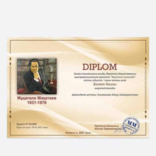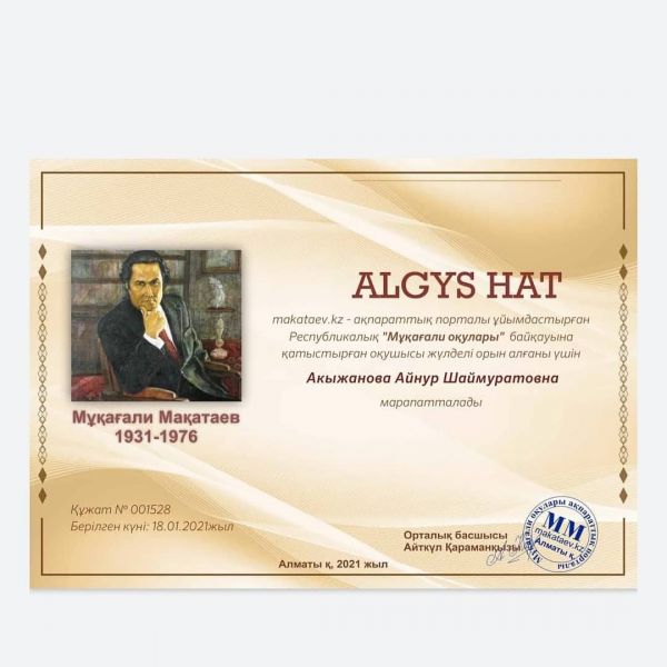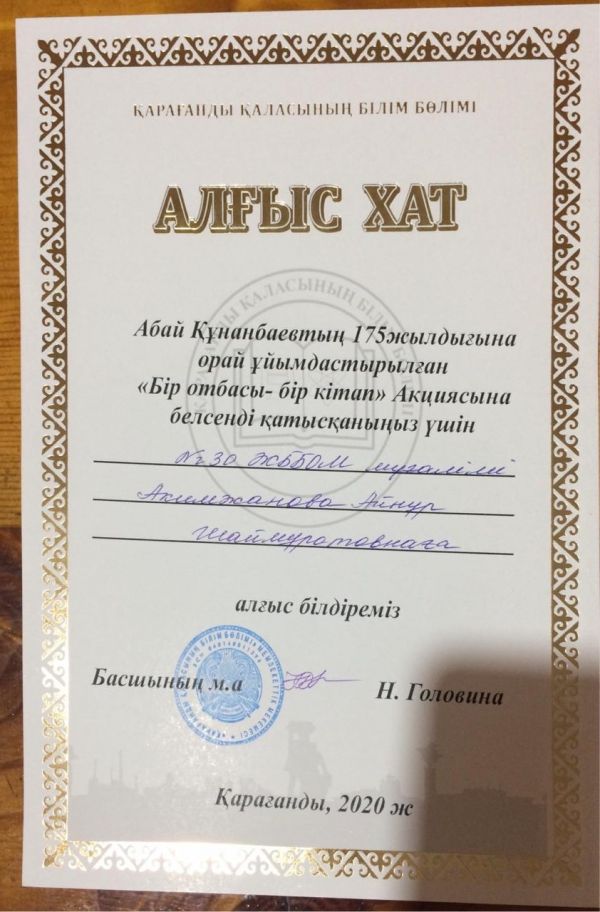 Қарағанды қаласының білім бөлімі Абай Құнанбаевтың 175 жылдығына орай ұйымдастырылған «Бір отбасы – бір кітап» Акциясының 5-6 сыныптар арасында ІІІ-орынға ие болғаны үшін №30 ЖББОМ…