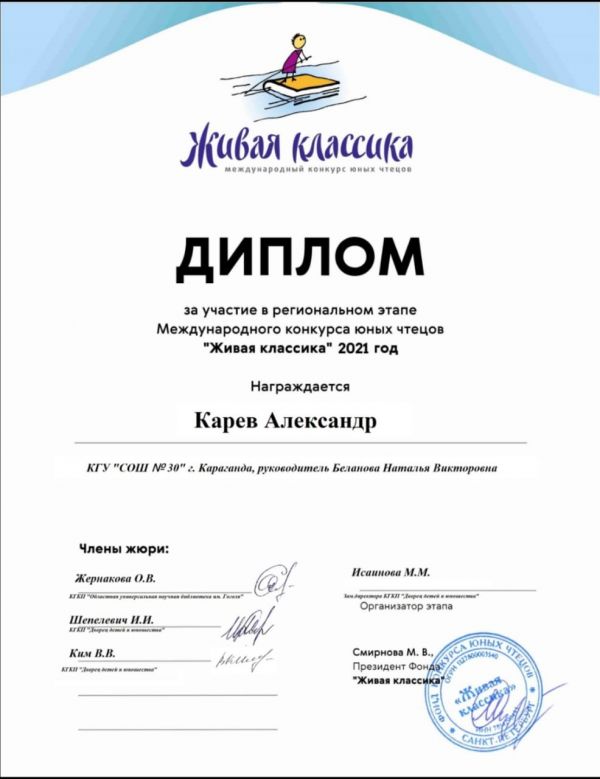 Учащиеся 5 Б класса Пеньковская Таисия и Карев Александр награждены Дипломами за участие в международном конкурсе юных чтецов "Живая классика" 2021 год. ПОЗДРАВЛЯЕМ!