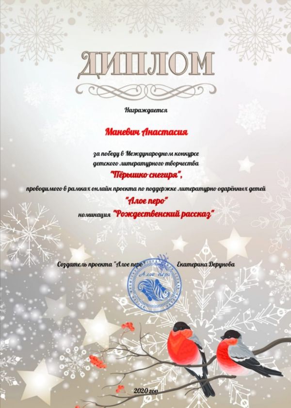 Поздравляем ученицу 5в класса Маневич Анастасию за победу в международном конкурсе литературного творчества "Алое перо" ! Так держать!