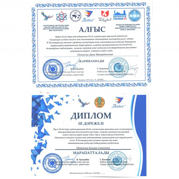 "Заманауи әлемдегі ғылым мен инновацияны дамытудағы жастардың рөлі " инновациялық жобалар байқауының жеңімпазы 7-а сынынп оқушысы Матенова Балжан 3-орынмен ма…