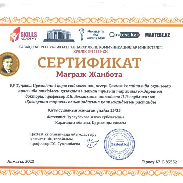 профессор Е,Б.Бекмаханов атындағы II Республикалық "Қазақстан тарихы" олимпиадасының жеңімпазы 7-а сынып оқушысы Мағраж Жанбота 1-орынмен марапатталады Жетекшісі: Т…