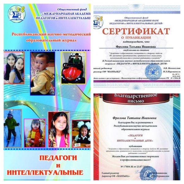 Хотим поздравить Фролову Т.И. за публикацию в Республиканском научно-методическом образовательном журнале ПЕДАГОГИ И ИНТЕЛЛЕКТУАЛЬНЫЕ ДЕТИ на тему: «Акценты в образовании смещаются в сторону м…