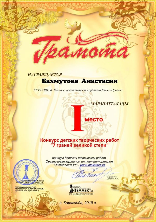 Поздравляем учащихся 1 «Б» класса за занятое 1 место в конкурсе детских творческих работ «7 граней великой степи» журнала «Интеллект kz» Адильмуратову Диляру, Кор…