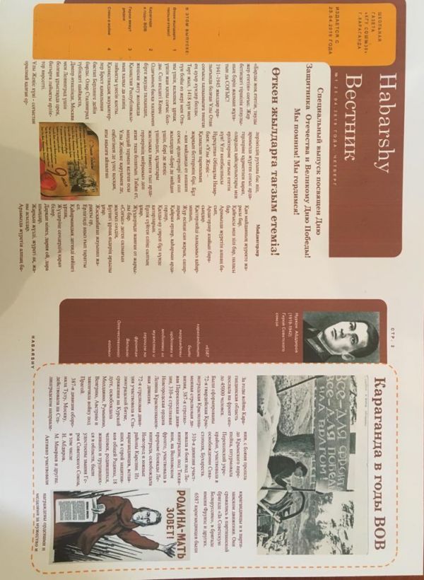 В преддверье праздника Дня Защитника Отечества и Великого дня Победы был выпущен специальный выпуск школьной газеты "Вестник". В газеты собраны статьи и Караганда в годы ВОВ, статья ученик…