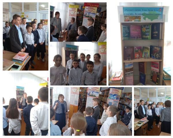 Алғыс айту күні қарсаңындағы апталық шеңберінде мектеп кітапханасында «Рахмет саған, Ұлы Дала Елі» «Спасибо, Великая Степная страна» атты тақырыпта кітап көрмесі рәсімделді, көрме материалдарымен 6 «Б» және 9 «В» сынып оқушылары таныстырылды.