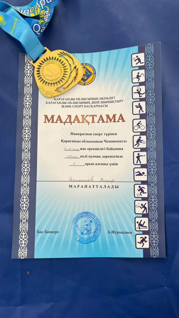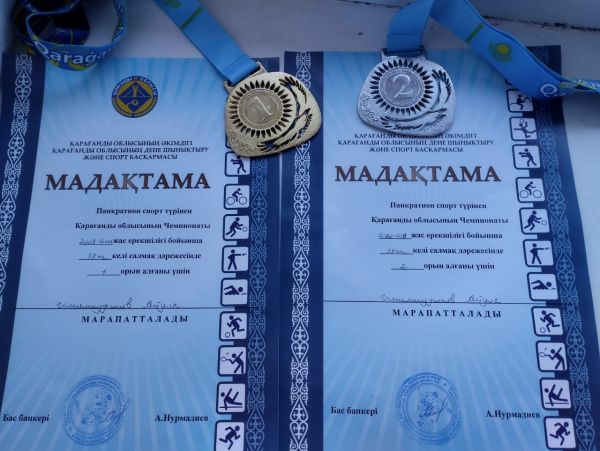 Панкратионнан спорт түрінен Қарағанды облысының Чемпионаты 2008-2009 жас ерекшелігі бойынша 38 келі салмақ дәрежесінде 1-2 орынды алғаны үшін Мадақтама