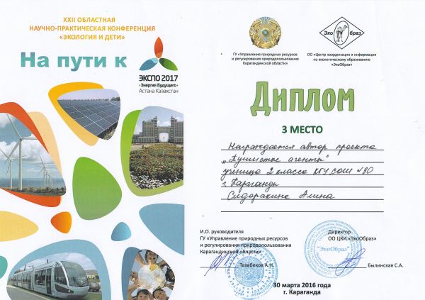 "Экология және балалар" облыстық ҒПК жеңімпазы 2 "Б" сынып оқушысы Сидоракина Алинаны құттықтаймыз!!! Жетекшісі: Российцева Е.А.