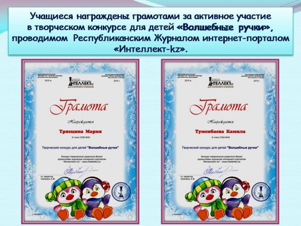 Учащиеся 4 «Б» класса: Аккерман Виктория, Шалапанов Константин, Боровской Станислав, награждены грамотами за активное участие в конкурсе мастеров и мастериц «Моё рукоделие»,…