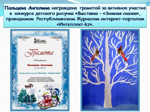 Учитель начальных классов, Чехранова Ирина Викторовна награждена грамотой за подготовку учащихся к конкурсу детского рисунка «Выставка – «Зимняя сказка», проводимом Республик…
