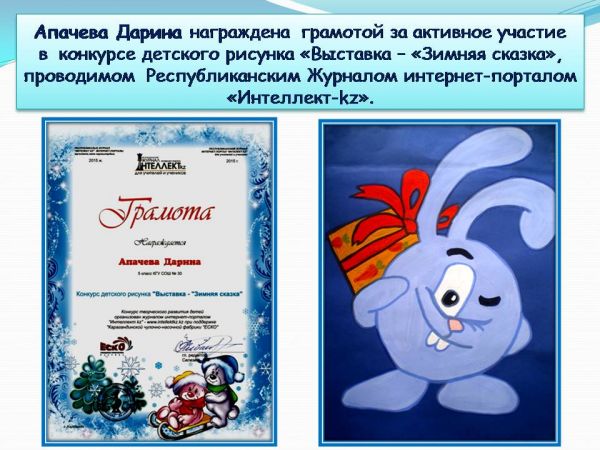 Учащиеся 0 класса: Иванищин Максим, Баязитова Лилия, Кенжебаев Жанал, Манякина Кира, Кецман Яна, Бадриденова Варя, Иванова Даша, приняли активное участие в конкурсе детского рисунка &laq…