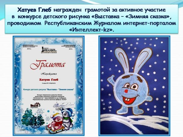 Ученицы: Ксатаева Аида, Полуянова Дарья, Ковалёва Виктория приняли активное участие в конкурсе рисунков "Мой Независимый Казахстан", и были награждены сертификатами.