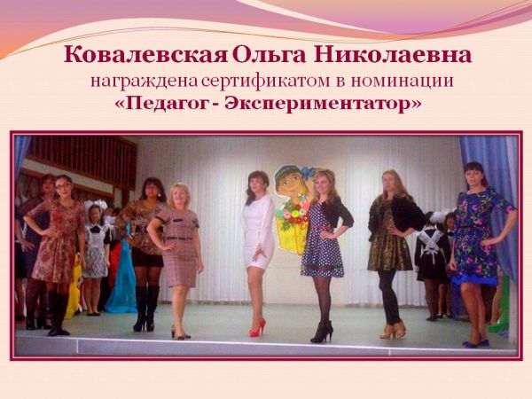 Ковалевская Ольга Николаевна приняла активное участие в городском конкурсе для учителей «Учитель года – 2015 города Караганды» и награждена сертификатом в номинации «Эксперим…