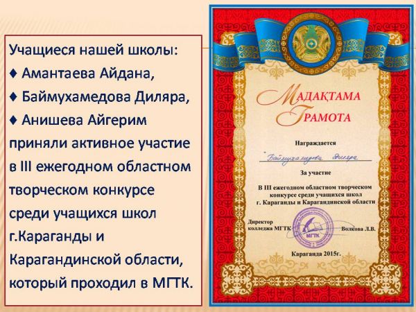 Учащиеся нашей школы: Амантаева Айдана, Баймухамедова Диляра, Анишева Айгерим  приняли активное участие в ІІІежегодном областном творческом конкурсе среди учащихся школ г.Караганды и Кара…