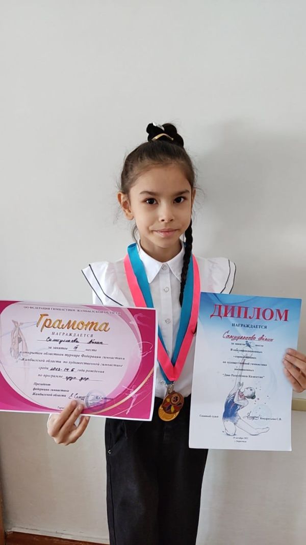 Поздравляем ученицу 3 "Б" класса Самиуллаеву Айлин. 1 место в квалификациионных соревнованиях по художественной гимнастике посвященных « Дню Республики Казахстан». 3 место в открытом областном турнире Федерации гимнастики Жамбылской области по художестве