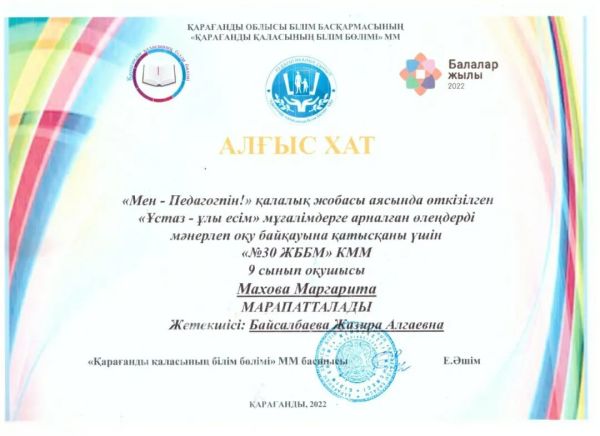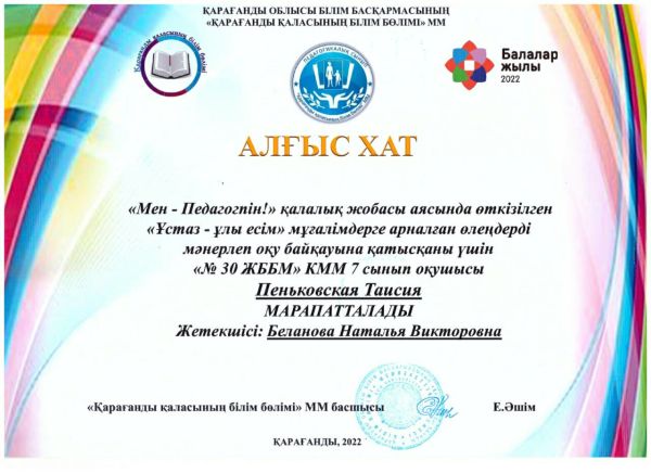 Пеньковская Таисия ученица 7 Б класса, Махова Маргарита ученица 9 класса, были награждены благодарственными письмами в городском конкурсе чтецов «Ұстаз- ұлы есім»