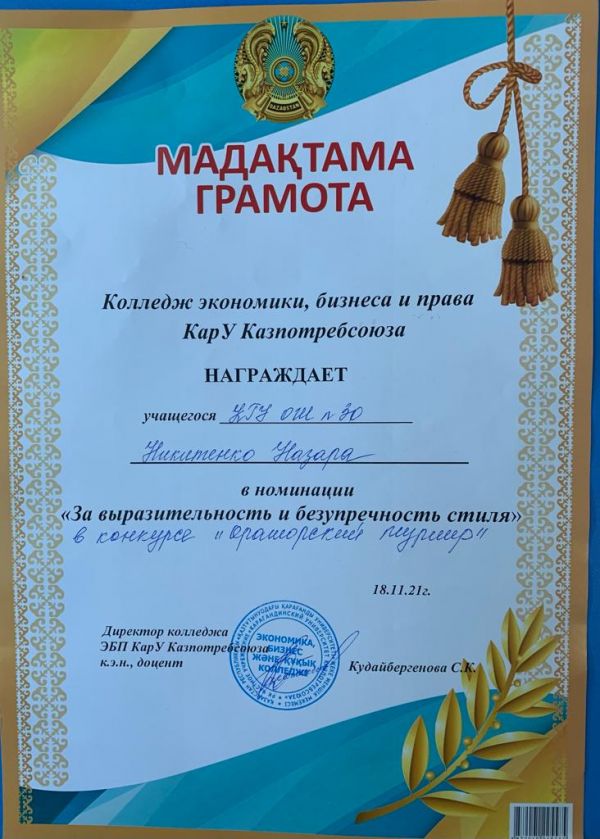 18 қарашада ҚарУ ҚазТО Қарағанды Экономикалық бизнес және құқық колледжінде қалалық байқау өтті. "Шешендік шеберлік" байқауы. Біздің мектептің атынан 9 "Г" сынып оқушысы Никитенко Назар қатысты. Ол грамотамен марапатталды.