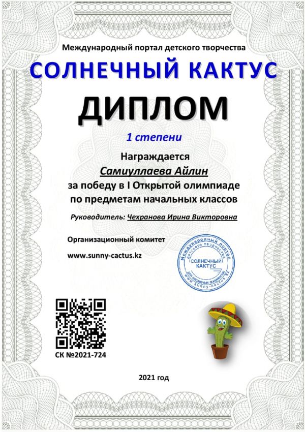 "Солнечный кактус" олимпиадасынан 1 орын алған 2 Б сыныбының оқушысы Самиуллаеву Айлин құттықтаймыз!