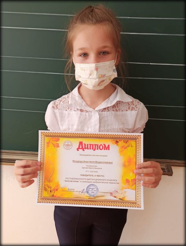 3в сынып оқушысы Мазарчук Анастасия "Алтын күз" атты Республикалық қашықтықтан өткен сайыста бейнелеу өнері номинациясында 2орын алып, дипломмен марапатталды.