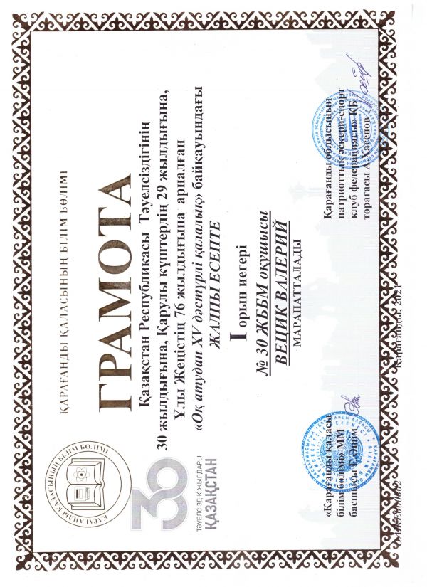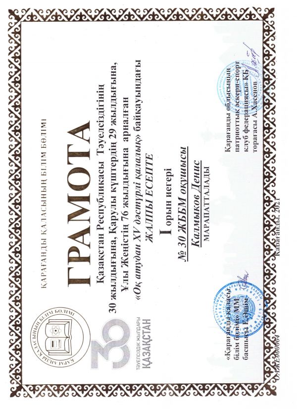 Қазақстан Республикасы Тәуелсіздігінің 30 жылдығы, мұғалімдер күніне арналған Қарағанды қаласы білім беру ұйымдары арасында оқпен ату XV дәстүрлі қалалық жарысында, біздің команда командалық және жеке есепте 1- орын алды.