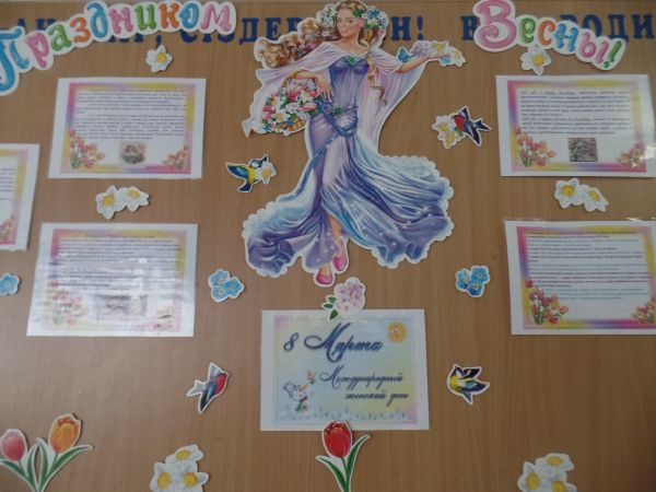 В преддверии празднования Международного Женского Дня был оформлен тематический стенд к 8 марта по следующим рубрикам: 1)      История возникновения  праздника 8 март…