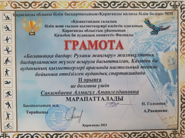 Біздің гимназияның педагогтары шахмат бойынша 1 орын, үстел теннисінен 2 орын, баскетболдан 1 орын алды