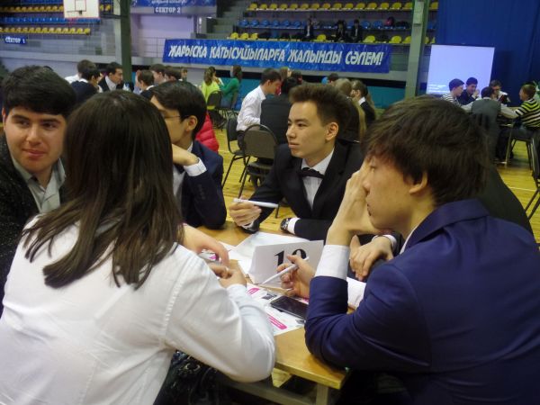 Учащиеся 8 классов КГУ "Гимназия № 38" в составе 15 человек (Абеев Д.Ж., Алексин Д.С., Баржаксынова Ю.Ю., Баулин С.А., Егорченко М.Д., Каменев Д.Р., Кобзева А…