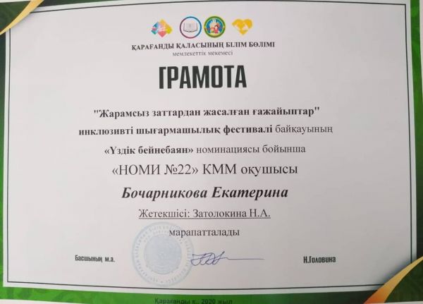 6-б сынып оқушысы Бочарникова Екатерина "Қажет емес заттардың ғажайыптары" қалалық инклюзивті шығармашылық фестиваліне қатысты. "Үздік бейнеролик"номинациясы бойынша жеңімпаздың…