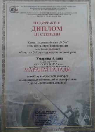 Поздравляем ученицу 7 "Б" класса Умарову Алину за занятое 3 место в областном конкурсе компьютерных презентаций, посвященных 70 - летию победы в ВОВ.