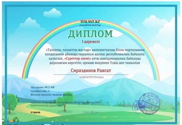Italant.kz учащийся 6" Б "класса Сираздинов Равгат, организованный интеллектуальным образовательным порталом"талантливая, целеустремленная молодежь", принял участие в конкурсе&qu…