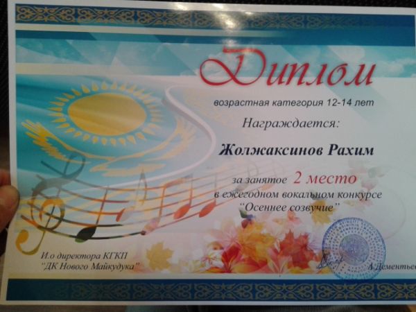 В Ново-Майкудукском доме культуры прошел конкурс под названием "Осеннее созвучие". Вокальном конкурсе участвовали дети в возрасте 12-14 лет.Ученик нашей школы Жолжаксинов…