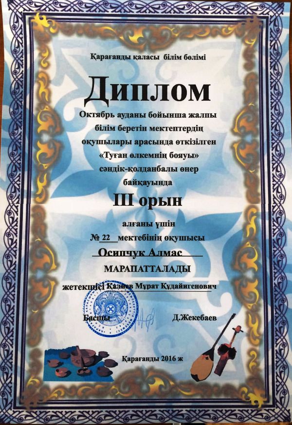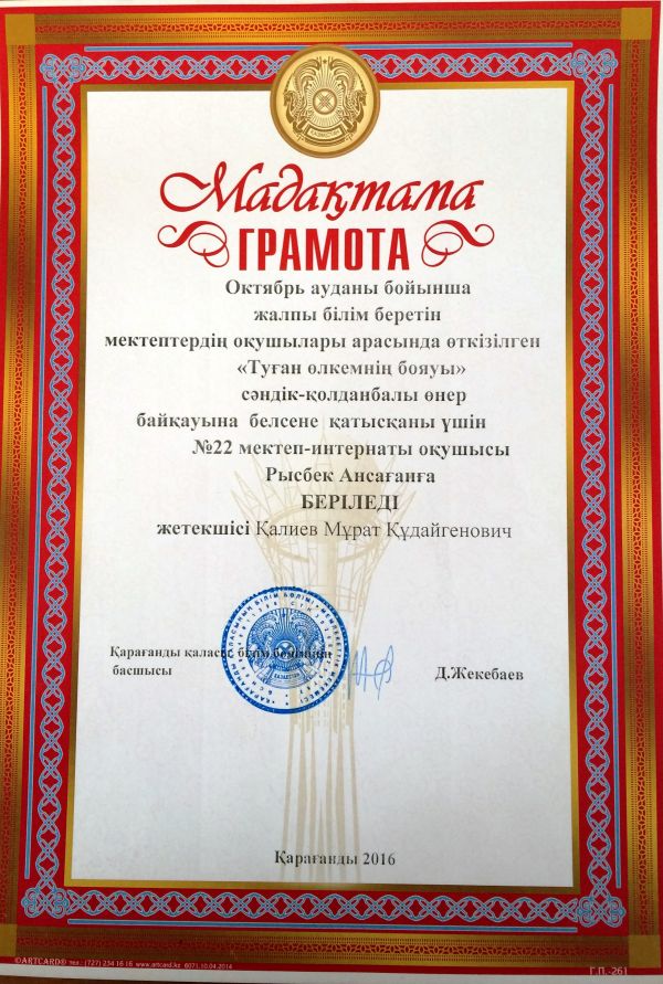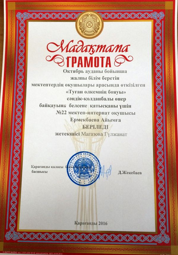Октябрь ауданы бойынша жалпы білім беретін мектептердің оқушылары арасында өткізілген «Туған өлкенің бояуы» сәндік-қолтаңбалы өнер байқауында: №22 мектеп – интернат оқушылары белсе…