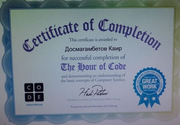 Ученики прошли задания,в процессе которых они познакомились с простыми этапами программирования.В конце урока каждый учащийся получили именной сертификат, о прохождении "Час кода"